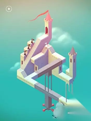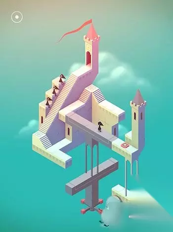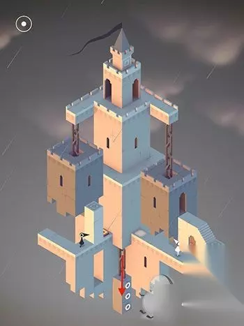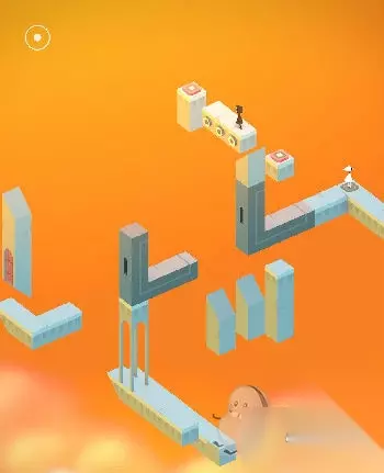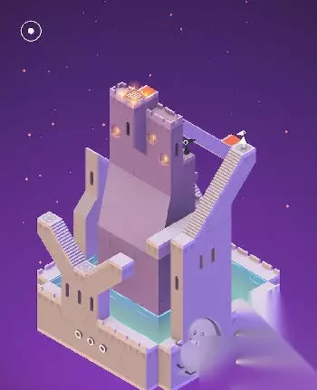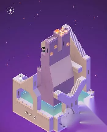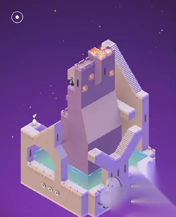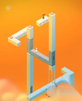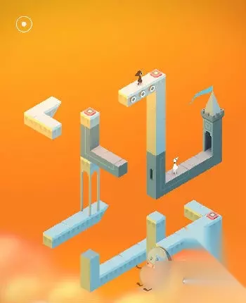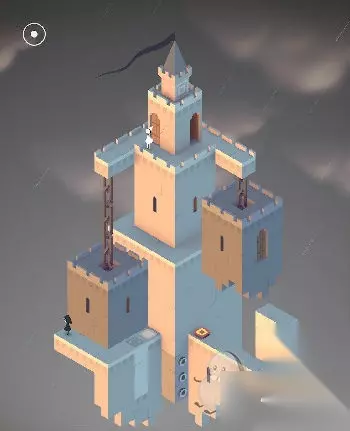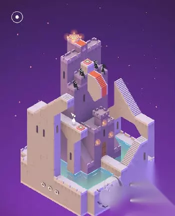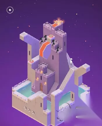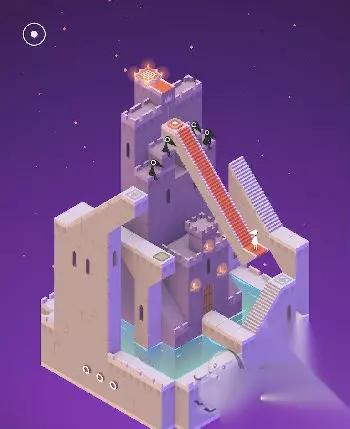 在出现的黑色场景中与蓝色精灵互动(几何神功,难道和如来神掌一样?吐槽不能)。直接走入洞口,出现在紫色城堡处。这里常需要各种旋转。首先让艾达走到制高点。