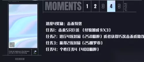 四、KDA任务第四天 1、再接再厉 队伍击杀5条小龙即可完成任务,在游戏中该任务可以通过多局任务进行累积完成; 任务奖励:经验加成卡*3 2、勇敢追梦 在游戏中进行四场游戏对局或者获得15次击杀或者助攻即可完成任务; 任务奖励:250蓝色精粹 3、更上一层楼 游戏中玩家只需要赢得两场游戏对局即可完成任务; 任务奖励:25魄罗币 4、阿狸专属任务 5场对局/对刚被魅惑的敌方英雄造成击杀或者助攻:在游戏里面完成5次游戏对局或者将刚被魅惑的敌人击杀或者拿到助攻; 任务奖励:400蓝色精粹 5、卡莎专属任务 5场对局/对1500距离外的敌人造成伤害3次:玩家需要完成5场对局或者使用技能对1500距离外的敌人造成伤害; 任务奖励:400蓝色精粹 6、阿卡丽专属任务 5场对局/潜行状态下对敌方英雄造成20次伤害:游戏里面玩家完成5场对局或者在潜行的状态下对敌人造成20次伤害; 任务奖励:400蓝色精粹 7、伊芙琳专属任务 5场对局/潜行状态下对敌方英雄造成20次伤害:游戏里面玩家完成5场对局或者在潜行的状态下对敌人造成20次伤害; 任务奖励:400蓝色精粹 8、萨勒芬妮专属任务 5场对局/减速、定身、魅惑3名敌方英雄:玩家在游戏里面完成五场对局或者减速、定身以及魅惑3名敌方英雄即可完成任务。 任务奖励:400蓝色精粹 第四天KDA任务活动奖励: 完成以上任务奖励KDA主题击杀纪念