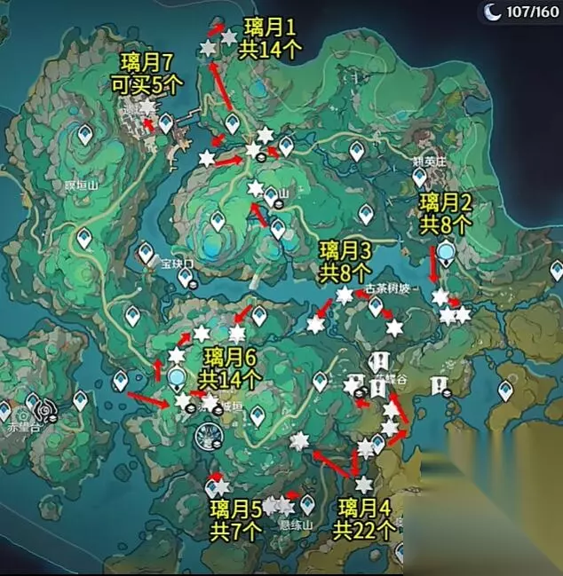 原神清水玉采集路线 路线一览: 一共有84个