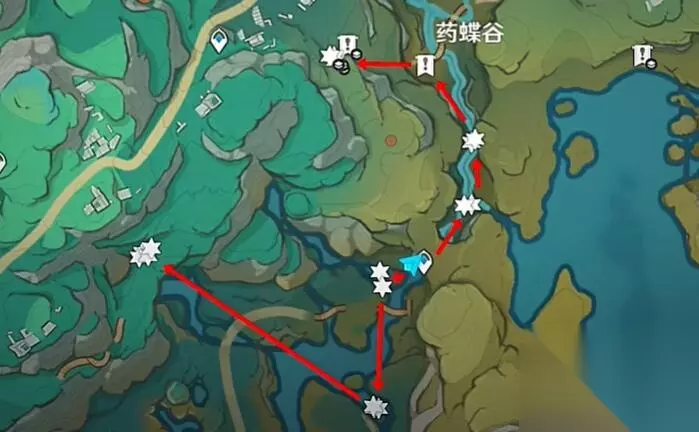 线路八 从药蝶谷锚点出发,敲击获得6个。