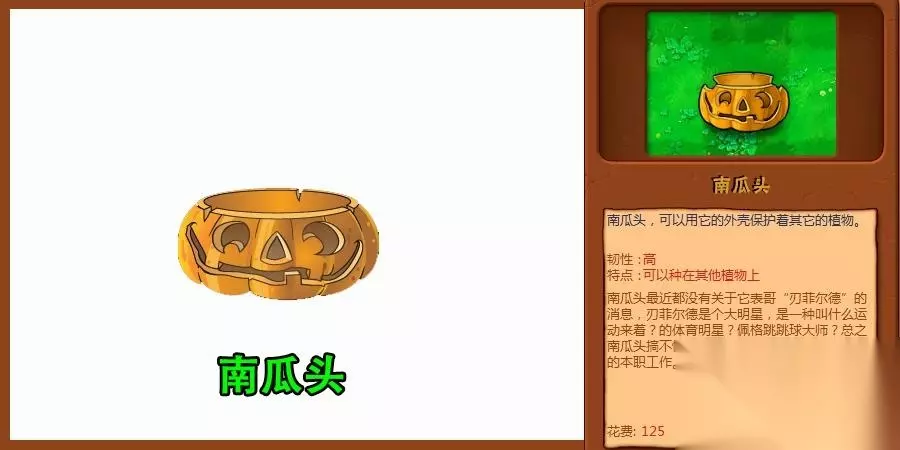 南瓜头并不能直接种植属于一种附属植物,拥有超强的韧性,而它的作用主要依附在植物上,可以帮助植物提升额外防御,让它们的生存能力更强。当给所有的植物配上南瓜头这种有超强韧性的植物时,植物的防御提高一倍不止,特别是高坚果这种本身就有非常强的防御植物,僵尸看到会不会特别头疼,防御还没破开已经团灭了。 2、坚果墙