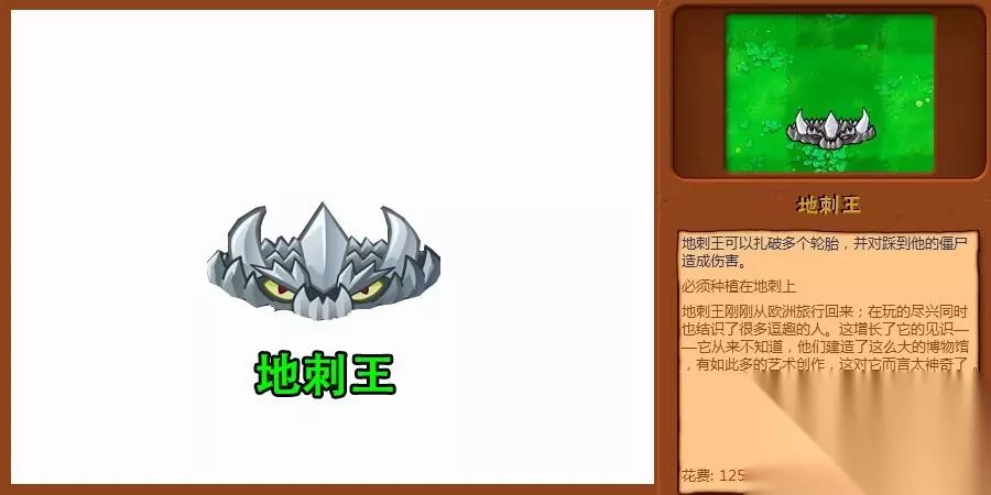 高坚果和坚果墙同样是防御植物,要说区别的话,高坚果其实就是坚果墙的升级版,防御比坚果墙厚,比坚果墙要高,不会被僵尸跨过和越过。如果坚果墙是前期的防御利器,那么高坚果就是后期关卡的防御神器。拥有超高的防御,而且不会被僵尸跨过和越过,当一排两排的高坚果出现,僵尸们看到估计都头疼了 4、地刺王