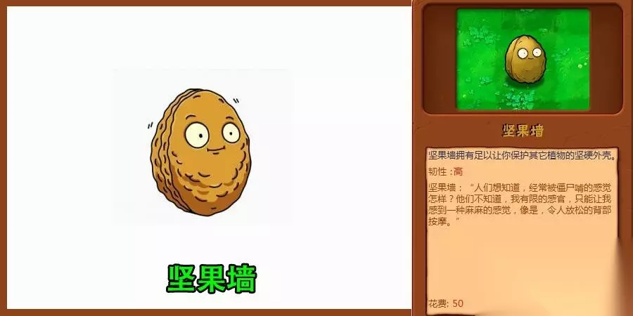 坚果墙属于一种防御植物,主要是利用自身极高的防御来抵挡僵尸入侵的脚步,好让攻击植物能更好的对僵尸集火剿灭,虽然说坚果墙并不算得上是防御更高的,但是在前期关卡的僵尸伤害并不高,而这种坚果墙的防御足够可以抵挡僵尸的脚步了。虽然坚果墙能被僵尸越过,但是种植两排坚果墙的话,僵尸就无奈了,估计看到都头疼。 3、高坚果