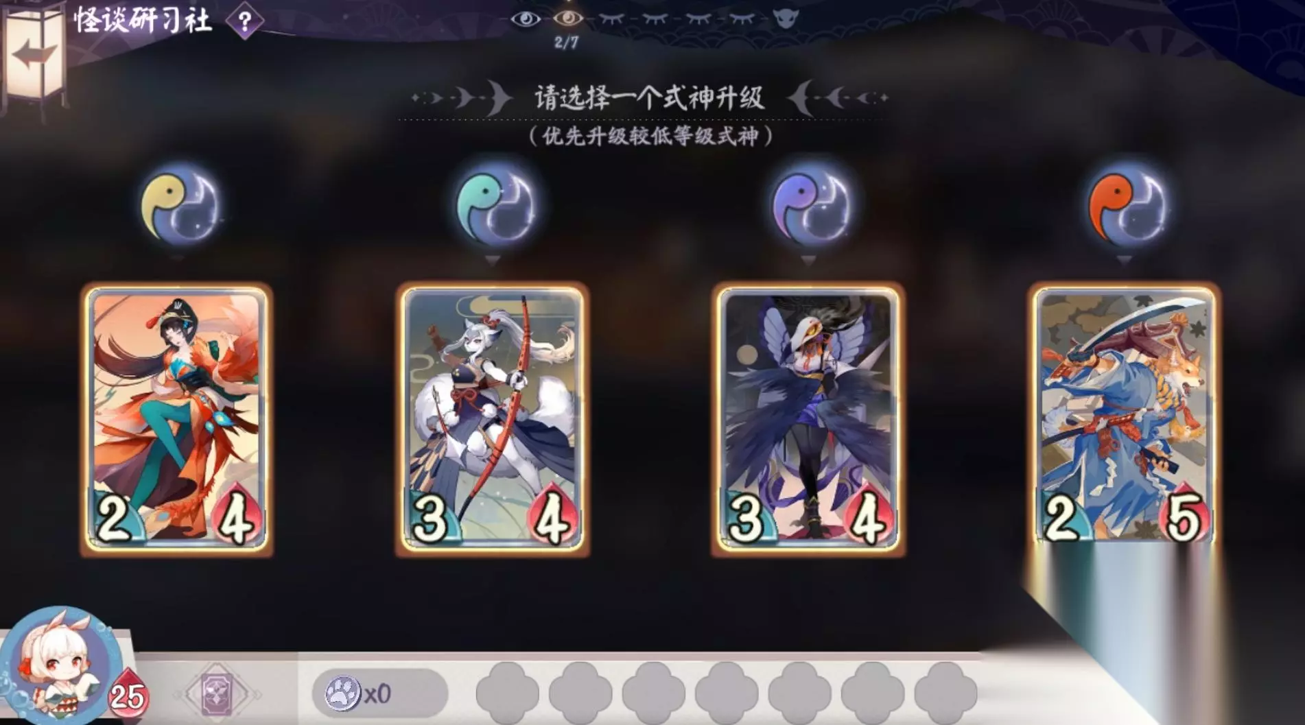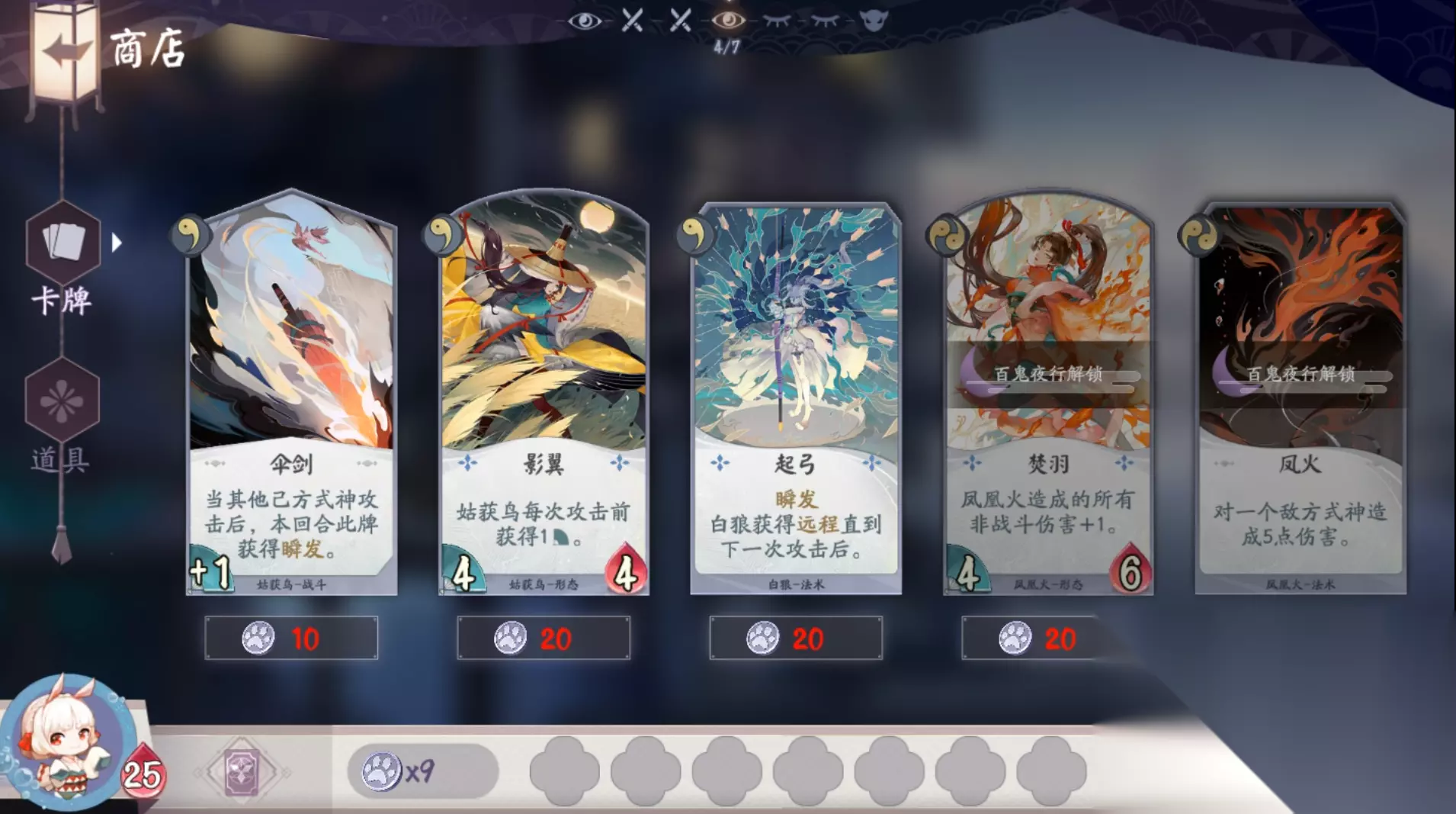 进入商店,可以利用猫爪钱币钱币购买卡牌,或者道具。 第五关:对战跳跳妹妹 敌方牌手:跳跳妹妹 牌手血量:20点 被动技能:坏人快走开 技能效果:免疫所有伤害,进入自己的第5回合时,玩家直接获胜 阵容:犬神、桃花妖、雪童子、鸩 特殊式神:无 第六关:商店 进入商店,可以利用猫爪钱币钱币购买卡牌,或者道具。 第七关:对战书翁 敌方牌手:书翁 牌手血量:20 被动技能:知识较量 技能效果:玩家回合结束时,将使手牌较多一方的随机一名式神获得+1力量+1生命 阵容:大天狗、凤凰火、雪女、鸩 特殊式神:无