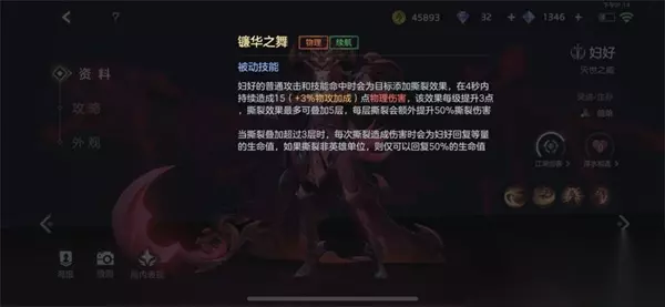 1、被动技能:镰华之舞 妇好的普通攻击和技能命中时会为目标添加撕裂效果,在4秒内持续造成15(+3.0%物攻加成)点物理伤害,该效果每级提升3点,撕裂效果最多可叠加5层,每层撕裂会额外提升50.0%撕裂伤害 当撕裂叠加超过3层时,每次撕裂造成伤害时会为妇好回复等量的生命值,如果伤害的目标是英雄,则额外回复0%的生命值; 妇好的被动攻击敌人或者技能命中敌方都会为敌方附加debff撕裂效果,同时debuff超过3层的话则为妇好提供大量的恢复效果,此DEBUFF能够同时作用多个目标,也就是说只要冲进人堆里或者怪堆里给大伙上一套debuf,回血嗖嗖的就上来了;