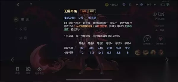 3、二技能:无畏奔袭 妇好向前方突进一段距离,并对周围进行一次斩击,对敌方单位造成160(+40.0%物攻加成)点物理伤害,并减少其20.0%点移动速度,持续2秒 不灭战魂:提升冲锋速度,同时减速效果提升至40.0%; 无畏奔袭作为妇好唯一的一个位移技能,前期伤害一般,技能CD偏长,被击中的玩家会获得一层撕裂同时减速敌方20%移动速度2秒,打野的时候,我们一般都是比较偏机动性强一点的,我们在打野的时候可以优先考虑把此技能学满,满级的无畏奔袭仅仅只有8秒钟,是一个不错的突进和撤退好技能,既能翻墙又能减速敌人;