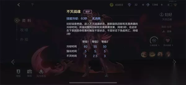 4、大招:不灭战魂 妇好战意燃烧,进入不灭战魂状态,刷新旋风回斩和无畏奔袭的冷却时间,并强化旋风回斩和无畏奔袭效果,持续5秒,在此状态下受到致命伤害时触发不灭状态,不灭状态下免疫死亡,持续2.5秒; 妇好的大招跟大多数英雄的大招都不太一样,不是造成多少多点伤害,而是为自身提供一个超强BUFF,激活大招的时候瞬间刷新一技能和二技能,同时1技能变成旋风斩,没变身前的一技能只会造成一次伤害,变身后的一技能变成一个持续数秒的旋风斩,被旋风斩击中的敌方单位每0.5秒都会叠加一层撕裂效果,同时二技能的释放速度变快且减速变成降低地方啊40%移动速度,当大招开启期间,如果妇好受到致命伤害,妇好不会躺下,会进入一个持续2秒的免疫死亡时间!这也是妇好相当强的一个效果,在这期间很容易将敌方反杀;