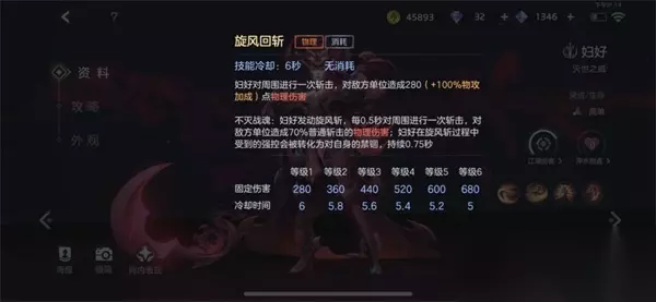 2、一技能:旋风回斩 妇好对周围进行一次斩击,对敌方单位造成280(+100.0%物攻加成)点物理伤害 不灭战魂:妇好发动旋风斩,每0.5秒对周围进行一次斩击,对敌方单位造成70.0%普通斩击的物理伤害; 被妇好的旋风回斩击中的目标回积攒一次撕裂,而不灭战魂状态下的回斩每次造成的伤害只有70%的物理伤害加成不会获得固定伤害加成;