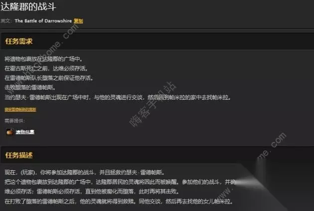 任务完成地点 玩家会获得下面这样的一包遗物包裹,玩家需要带着它前往达隆郡。 到达达隆郡之后,在小镇正中间的广场上放下这个包裹。 遗物包裹 玩家放下包裹之后,战斗就会开始打响,玩家在幻影中重现达隆郡的那场战斗。 这个任务一个人是绝对没法做的,玩家需要组织一个团队,一般最好是10人以上。 具体路线: