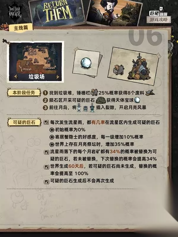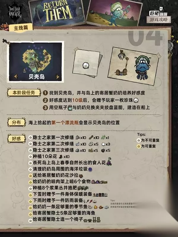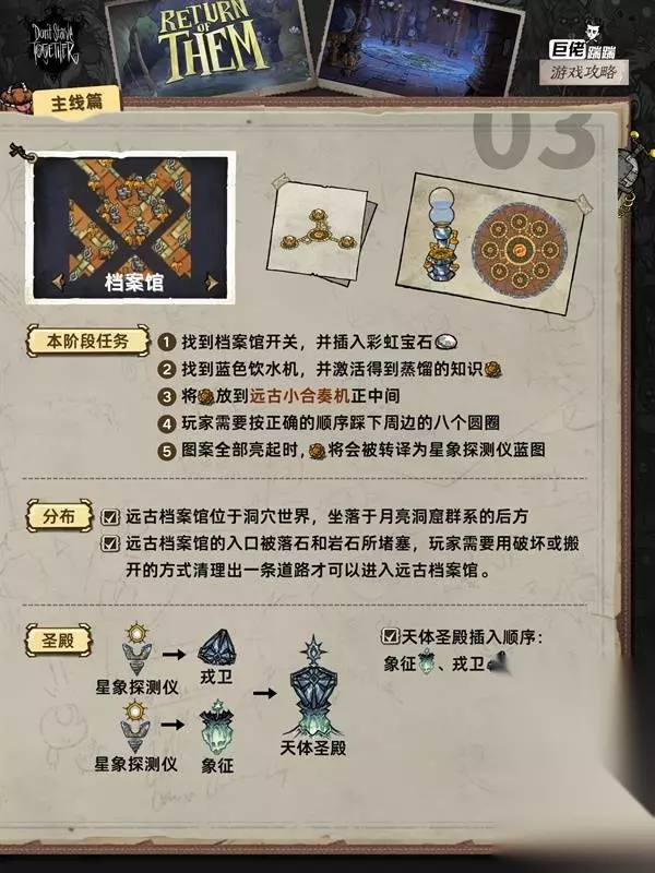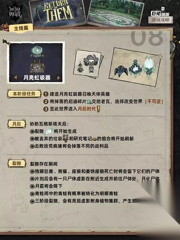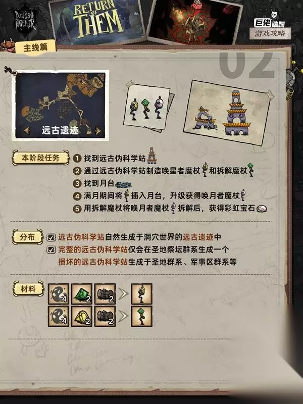 这是《饥荒联机版》的主线流程攻略,涵盖月岛、远古遗迹等多个区域的主线任务,包括找到月岛搭建天体祭坛、在远古遗迹制作魔杖、和寄居蟹奶奶提升好感等任务的完成方法,助力玩家推进主线。
