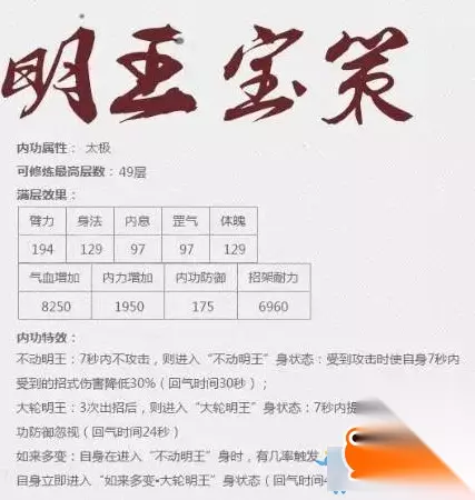 明教五内:明王宝策 内功属件:太极 可修炼最高层数:49层 满层效果:臂力194;身法129;内息97;罡气97;体魄129;气血增加8250;内力增加1950;内功防御175;招架耐力6960. 内功特效: 不动明王:7秒内不攻击,则进入不动明王”身状态:受到攻击时使自身7秒内受到招式伤害降低30%(回气时间30秒); 大轮明王:3次出招后,则进入“大轮明王”身状态:7秒内提升自身30%的内外功防御忽视(回气时间24秒); 如来多变∶自身在进入不动明王”身时,有几率触发“如来多变”:下次出招自身立即进入“如来多变大轮明王”身状态(回气时间45秒)。 看了上文233乐园小编带来的九阴真经明教五内,你是否了解了相关内容信息,知道了呢!更多最新最好玩的手机游戏就来233乐园下载吧!