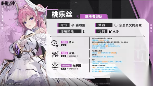 胜利女神新的希望桃乐丝抽取指南 一、角色定位 阶段:爆裂一 武器:步枪 职业:辅助型 属性:水冷 二、技能 技能1:50次的射击后提供一个减爆裂cd,非常实用,同时在大招期间全队零件伤害大幅提升,对付火车之类零件多的敌人非常好用,还能够给全队提供一定的奶量。 技能2:单次倍率不高的分摊伤害,但是在开启爆裂后最多释放5次,算下来倍率不错,伤害在目前所有爆裂一中是最高的。同时能给所有敌人挂上一个10%的全员易伤 技能3:技能2的cd减少18秒,同时挂上一个烙印,在爆裂结束后对敌人造成一次累计伤害的分摊伤害,大大提升了桃乐丝的输出伤害。