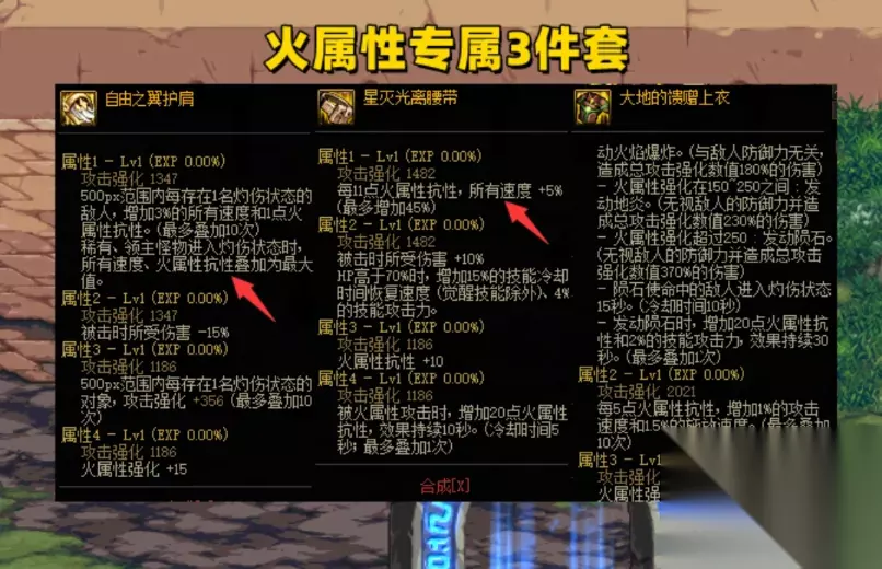 大家仔细观察,这3件装备有共同点。 它们在带来大量攻速加成的同时,彼此之间也有着非常密切的联动关系! 比如《星光腰带》要求耐火99,顶垫和肩垫都可以提供耐火; “自由肩膀”需要燃烧效果,顶部提供完全燃烧状态; “地顶”要求耐火性强,顶和肩垫都自带15火力;