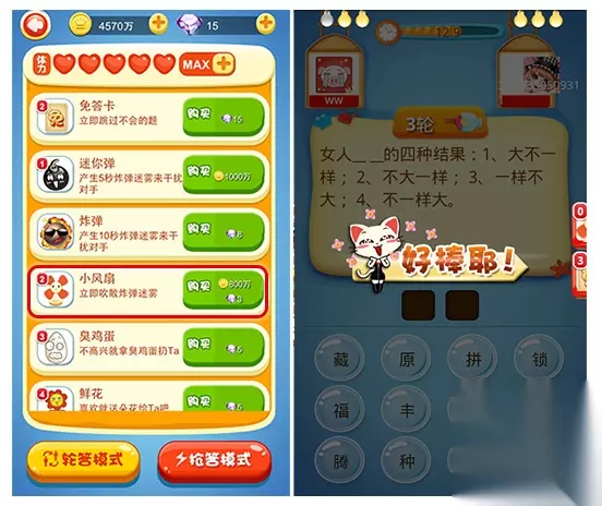 炸弹克星——小风扇 在PK的时候遇到炸弹怎么办?不用担心,小风扇为你迅速吹走迷雾。当你的对手向你释放炸弹时,你只需第一时间点击小风扇,迷雾即可消失,而你则可以继续正常答题。