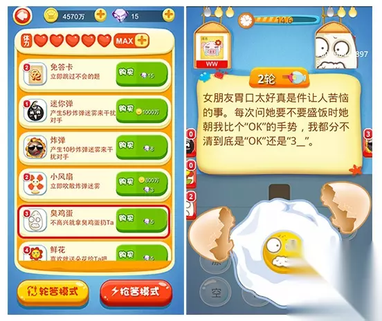 束手无策——臭鸡蛋 炸弹的用处在于造成烟雾遮挡题目内容,而臭鸡蛋的作用则是遮住答题文字,因此在PK过程中,你必须预估玩家的阅读时间,当他准备答题时,丢出臭鸡蛋,遮住文字栏,让他无法选择正确答案。