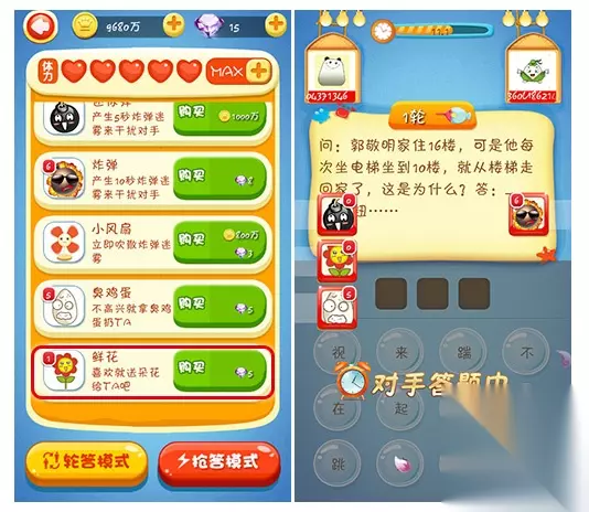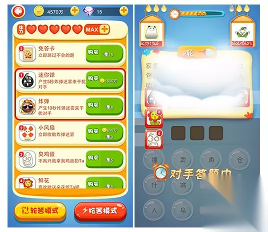 经济实用——炸弹&迷你弹 在PK过程中,在题目文字出现的当下,你需要迅速的丢出炸弹或迷你弹,造成烟雾,阻挠对方看清题目内容。并且在烟雾快要消失的前一秒继续丢出炸弹,让玩家在答题的时间内都无法阅读题目。