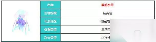 3、幽暗水母 分布在艾芙海姆-暗精灵区域,生物等级是精英怪,它擅长远程法术攻击,仇恨类型是主动攻击。