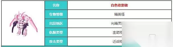 5、白色收割者 分布在艾芙海姆-光精灵区域,生物等级是精英怪,它擅长近战物理攻击,仇恨类型是主动攻击。