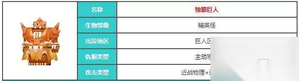 2、独眼巨人 分布在艾芙海姆-巨人区域,生物等级是精英怪,它擅长近战物理 远程法术攻击,仇恨类型是主动攻击。