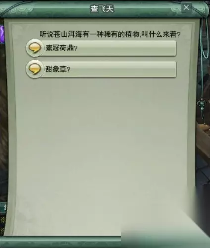 和NPC【查飞天】对话,可以选择交【素冠荷鼎】或者【甜象草】: