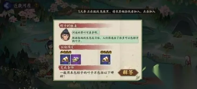 阴阳师6月18日端午答题的问题是关于包粽子的叶子,想要让玩家在几个选项中找出包粽子的叶子不包括的一类,具体的选项和答案233乐园小编都会在下面为玩家们分享,想要了解更多那么就赶紧参考下面的攻略了解一下吧。 阴阳师6月18日包粽子的叶子答案介绍 对话剧情一 河边的草叶可真多啊。 根据各地的生态及习俗,人们筛选出了很多可以包粽子的叶子。 正确答案的奖励是蓝色饭团2个和紫色饭团1个,错误奖励是2个蓝色饭团。 完成条件,答对问题帮助河原村民即可。