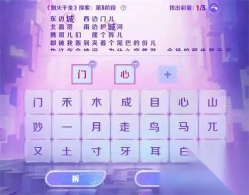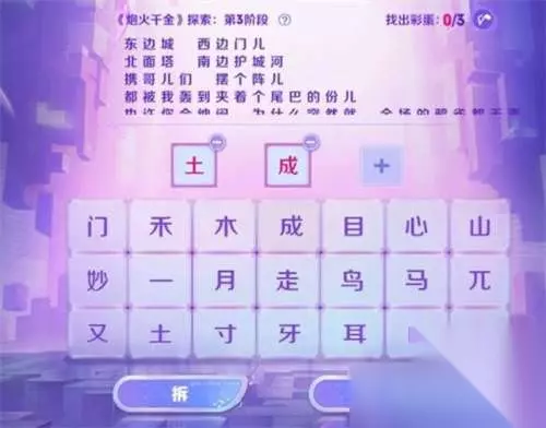 王者荣耀炮火千金探索是游戏中音你闪耀皮肤上线之后的一个活动,在这个活动玩法中玩家需要找到歌词中的字谜,可能有玩家在进行第三阶段你的探索过程中不知道怎么过,下面小编就给大家整理了具体的攻略,快来一起看看吧。 王者荣耀炮火千金探索第三阶段攻略 ①土+成