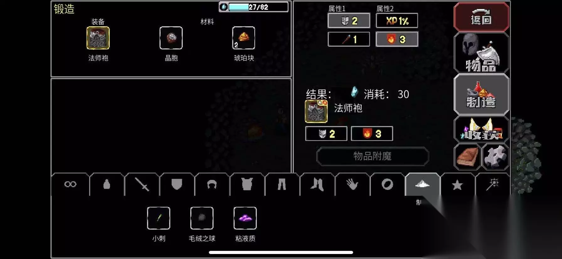 我们在击杀怪物或是开宝箱的时候一定会掉落很多资源,其中有些就是用来对于装备附魔的。里面包括小刺、琥珀块、粘液质。毛绒之球等等。我们在商店是经常看到一个红红的炉子,没错它就是用来锻造对装备附魔用的,当然它也不仅仅只是出现在那一个位置,一般情况下,我们在关卡中偶尔也会看得到,这时候就能把收集来的材料对装备附魔。