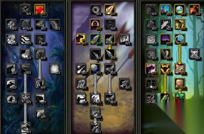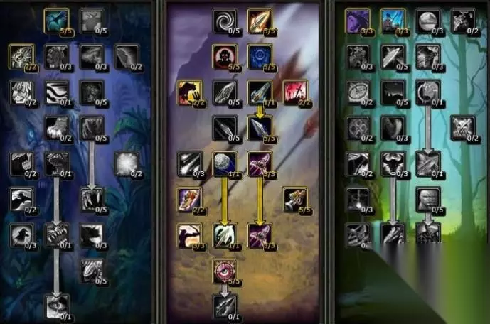 生存系 生存系得猎人在70级天赋中,增加了60级版本射击系的“鹰眼”天赋,另外还新增了6个天赋技能。 生存系猎人在魔兽世界中算是比较冷门的一直职业,可能主要还是由于兽王猎和射击猎太优秀了吧,所有没有给生存猎人表演的机会,其实生存系猎人也是比较强大的。尤其是在TBC阶段,PVP中超过1W+HP是很常见的,任何职业被秒的概率都不大,所以尤其突出了控制和生存的重要性,这里位大家推荐的一套PVP常用的生存系猎人天赋。