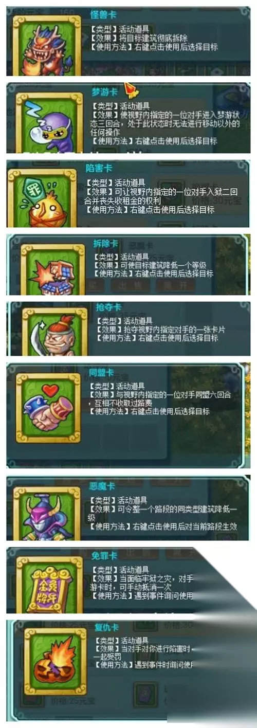 其中上图的梦游卡、陷害卡可以在开局使用,阻止其他NPC收购房屋,自己占领多数房屋。 接下来就是作用很大的,筹集资金的关键道具,经商必用: