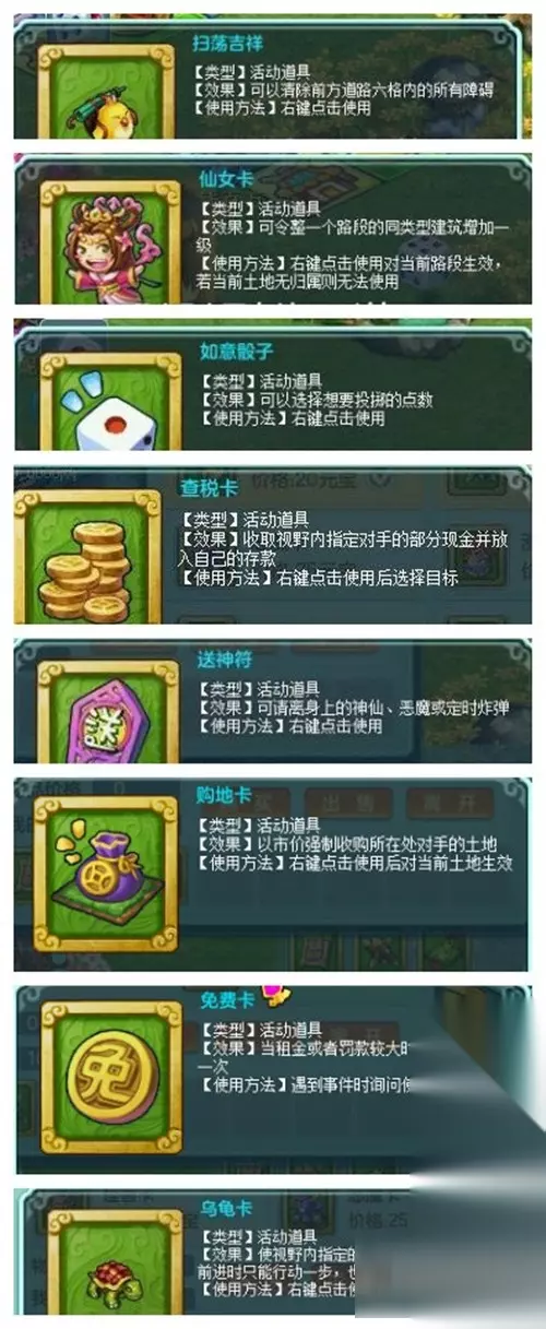 其中,查税卡的使用方法就是,购买以后在右下角。然后先按TAB查看一下另外三个人身上的钱,哪个现金多就抢哪个,右键道具左键人物即可,现在地图能移动了,所以更好使用这个道具。 查税卡是现金越多,抢到的钱越多。 这两个是差不多的,大衰神是百分百不让你买房,小的是有一定概率而已,需要尽量避开他们,或者用道具(扫荡吉祥)进行扫荡。