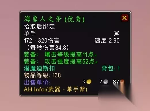 魔兽世界wlk海象人之斧怎么获得 海象人之斧是北风苔原任务奖励品,如果你的盗贼是做任务升到了80级,那么海象人之斧基本上跟你无缘,任务奖励的绿色装备不是卖到了商店,就是直接分解成了材料。有人会说可以找GM恢复物品,把海象人之斧恢复一下,这样就能得到AOE神器。其实这个方法也不可行,做完任务拿奖励一般会选择价格比较贵的装备,自然不会选择海象人之斧这把便宜的武器,没有获得过海象人之斧也就不能恢复。 其实除了首发职业是盗贼的玩家,其他的盗贼玩家都能拿到海象人之斧,因为许多玩家第二个号都是刷战场升级的,即便是偶尔做下任务,也都把北风苔原的任务给隔过去了。所以不是首发盗贼的玩家,赶快去补下任务,去拿海象人之斧这把AOE神器。