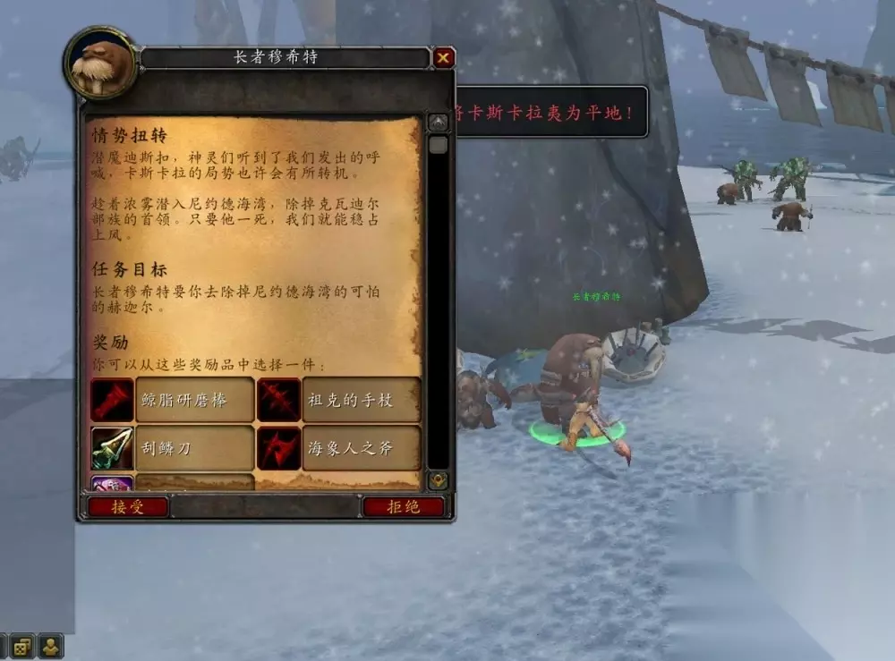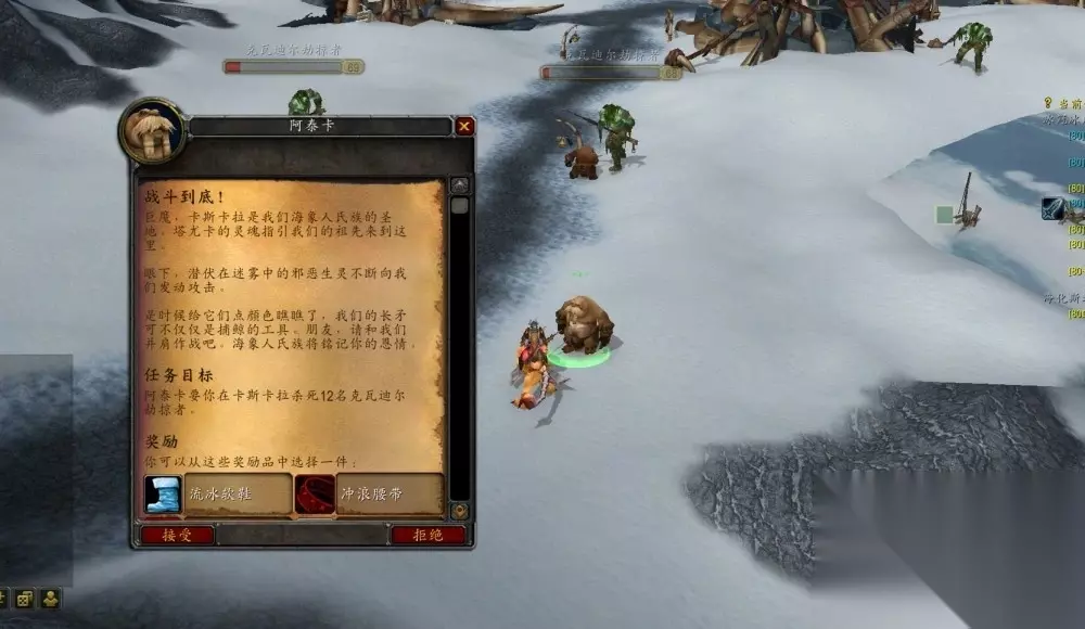 海象人之斧任务链非常简单,玩家只需要做4个任务就可以拿到,任务的起始点在北风苔原64.46附近,找阿泰卡领取“战斗到底!”的任务。80级来到这里是看不见黄色感叹号的,需要找到阿泰卡NPC主动领取任务,击杀12名科瓦第二掠夺者。