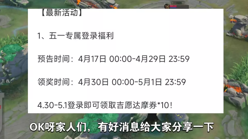 《决战!平安京》推出五一专属福利活动,4月30日-5月1日登录可领取吉愿达摩券*10,4月30日起还上线系列活动,可免费领取史诗皮肤、海量宝叶等福利。
