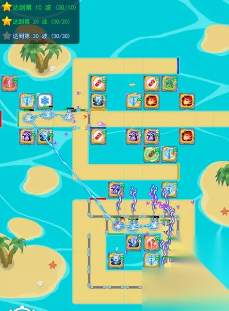 欢乐对决塔防7-3攻略 塔防7-3需要应对能量魔,风灵魔物,增殖小魔和盾灵魔物四种怪物,因此炮塔建议选择雷神,射手,破军,核弹,这一关的主要输出炮塔是雷神。 全地图共24个位置可以摆放炮塔,其中科技增幅的位置有7个,为了应对开局出现的能量魔,可以优先放置核弹,因为上方的路程是最短的,很容易漏怪,所以优先将输出炮塔摆放在上方路线周围,避免出现漏怪掉血的情况。 7-3的难点在于风灵魔物,因为雷神,射手,核弹和破军都只能造成50%伤害,所以可以在地图中放置功夫或流星来应对,不然很有可能会漏怪,全部炮塔摆放如下图所示。