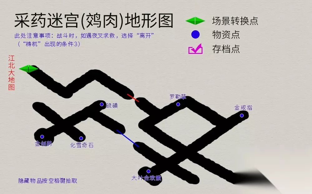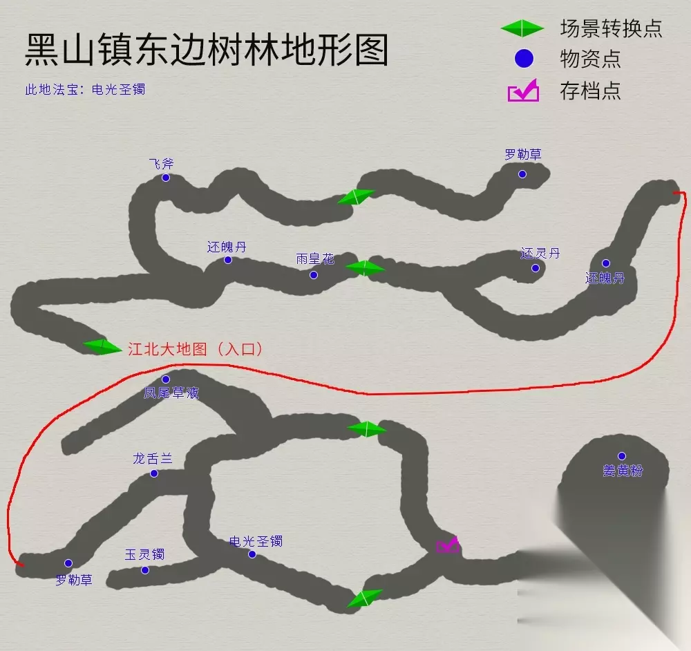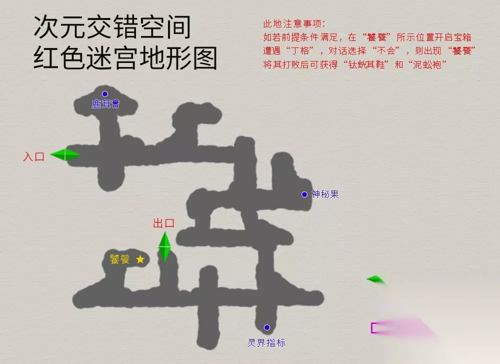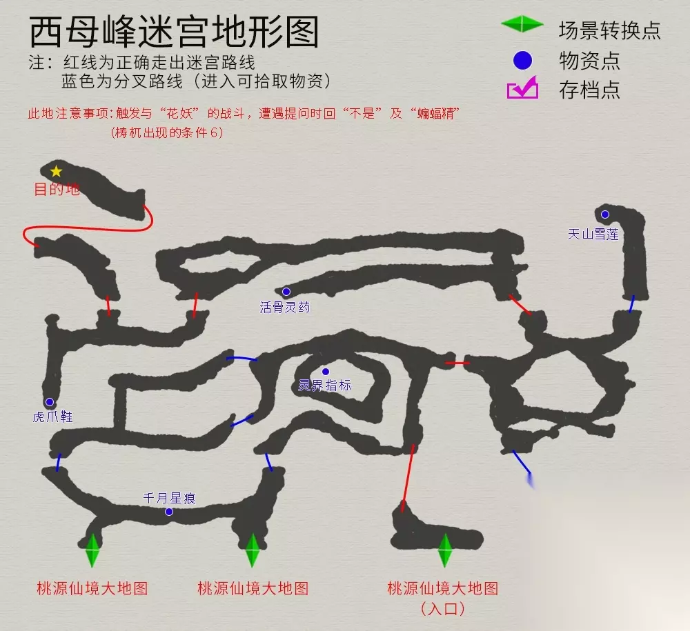 西母峰场景注意事项;触发与“花妖”的战斗,对话分别回答“不是”“蝙蝠精”(“梼杌“出现的条件6)。地图如下: