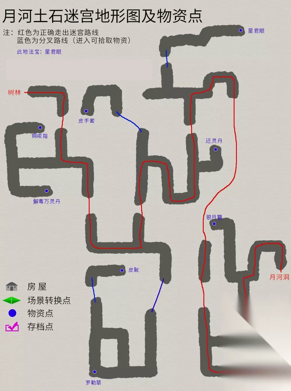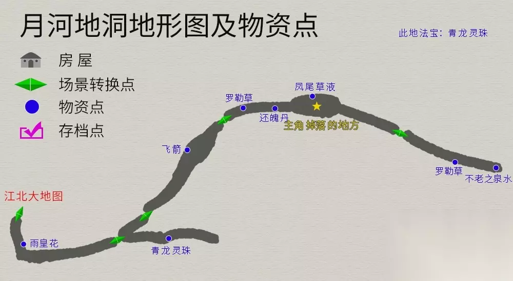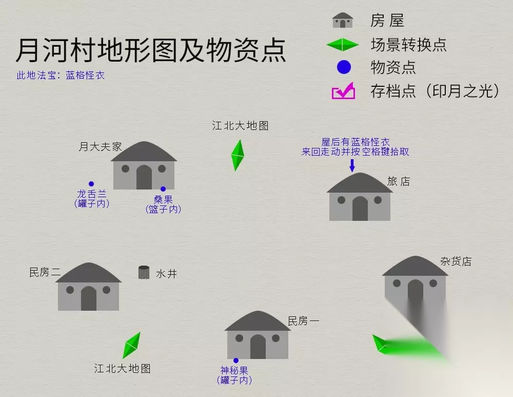 游戏开始,第一个场景--伏魔洞,这个场景地图太简单,就不放了,物品有洞察光环(法宝)、布帽、铜戒指,都在箱子内,容易找。 月河村 流程:桥头触发剧情→客栈投宿→第二天到药店打听消息→回客栈与掌柜对话→与客栈外右下角小孩对话→前往月河洞救人→返回村子→与鲛精战斗→被赶出村。 支线任务(打水):桥头乞丐→水井(一直按空格键,直到井中不再出水,可得钱*150、清水*9)→返回乞丐处,完成后奖励“金创药*1”。 村内法宝--蓝格怪衣(终极装备,别错过。建议进村后首先拿取,因为后面被赶出村后进不去)。地形图如下:
