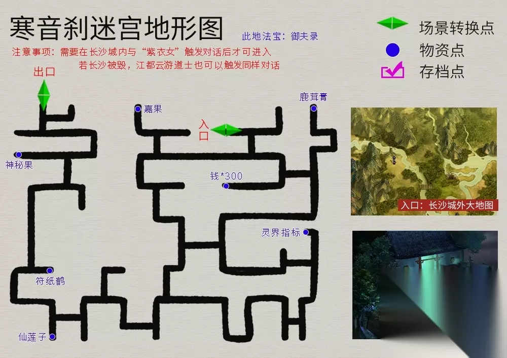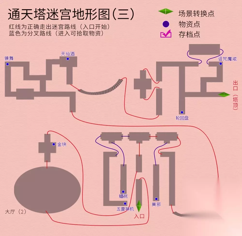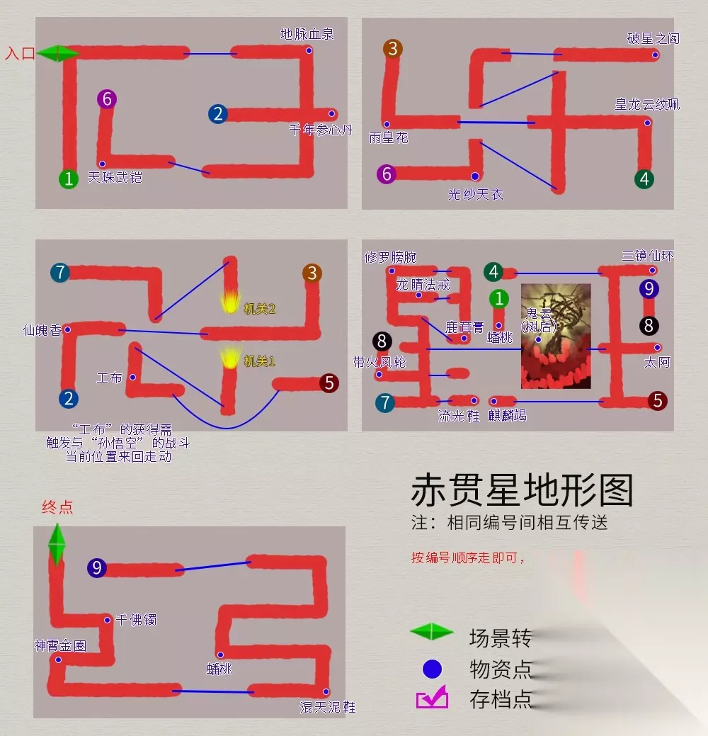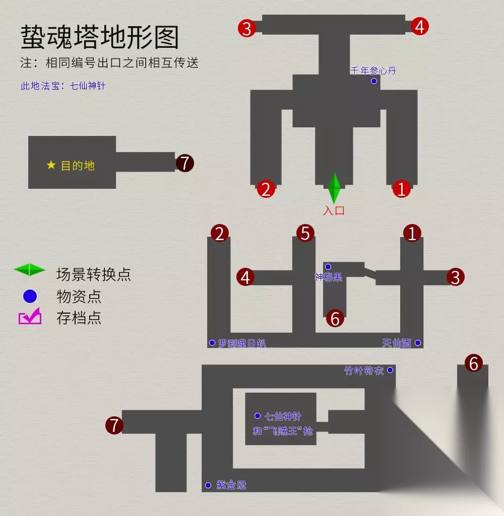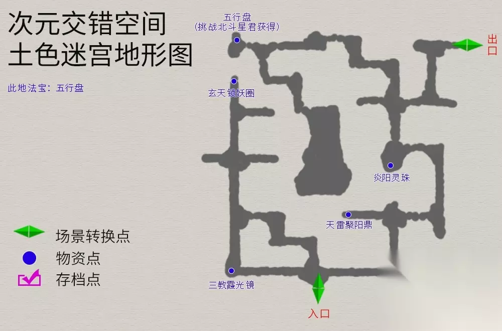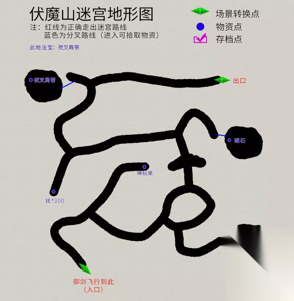 回到主线任务,院中与仙人对话,御剑前往伏魔山,迷宫地图如下(法宝--夜叉肩带):