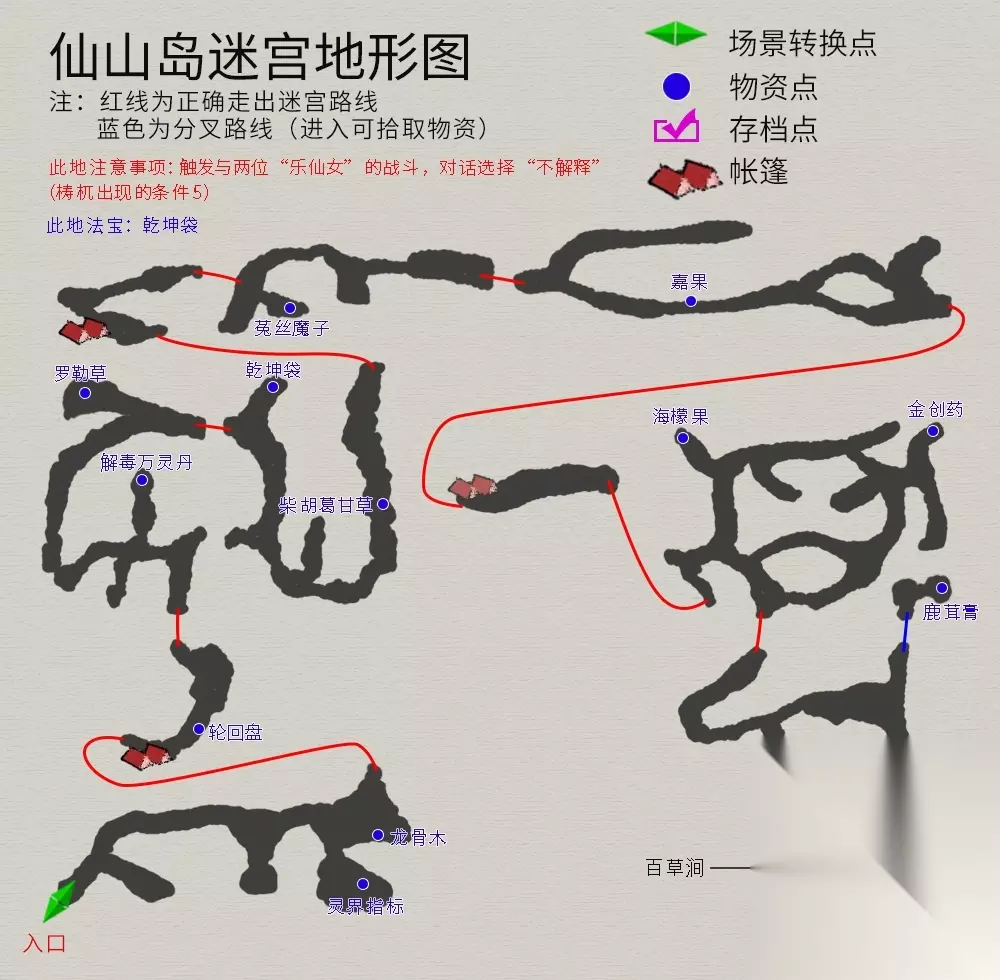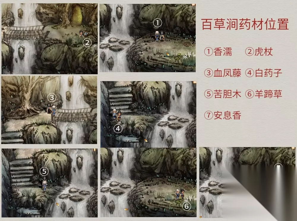 龙宫打败黑龙王,玉儿听信蛊惑取下崆峒印,氐人族族人变老。与跟随而来的两族民对话→返回氐人族→玉儿毁容→前往仙山。 仙山岛场景注意事项(第一或第二场景):触发与两位乐仙女的战斗,对话选择“不解释”(“梼杌”出现的条件5) 仙山岛玉儿伤情一路恶化,双目失明,靖仇往百草涧采药,各场景地图如下(内部法宝--乾坤袋):