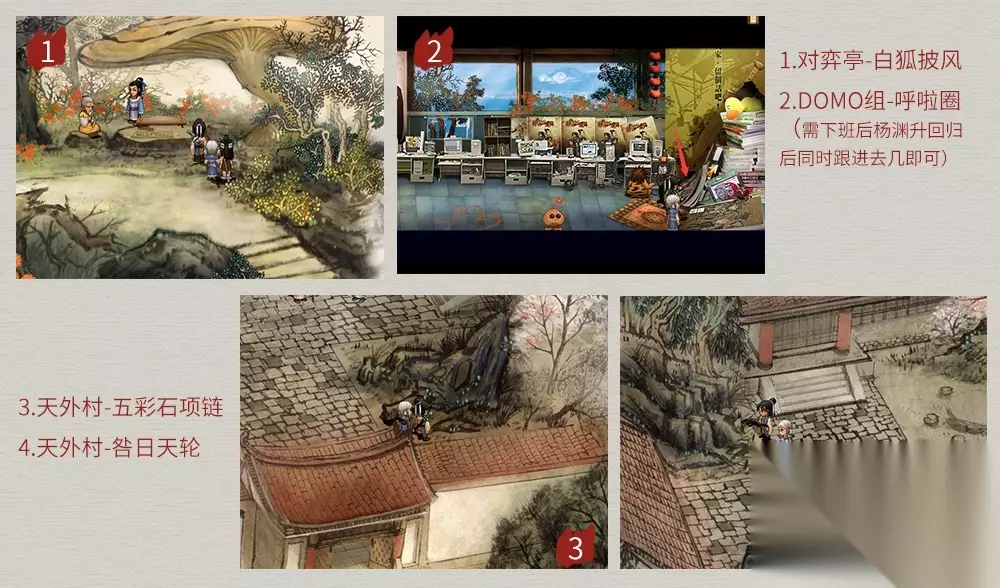 对弈亭→天外村→然翁居。一系列剧情后按古月吩咐往西母峰摘“血月蟠桃”,前往之前,可先搜集和店铺购买物品(“呼啦圈”先接取DOMO任务,然后跟随杨渊升返回),位置如图:
