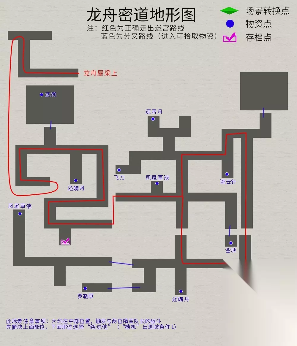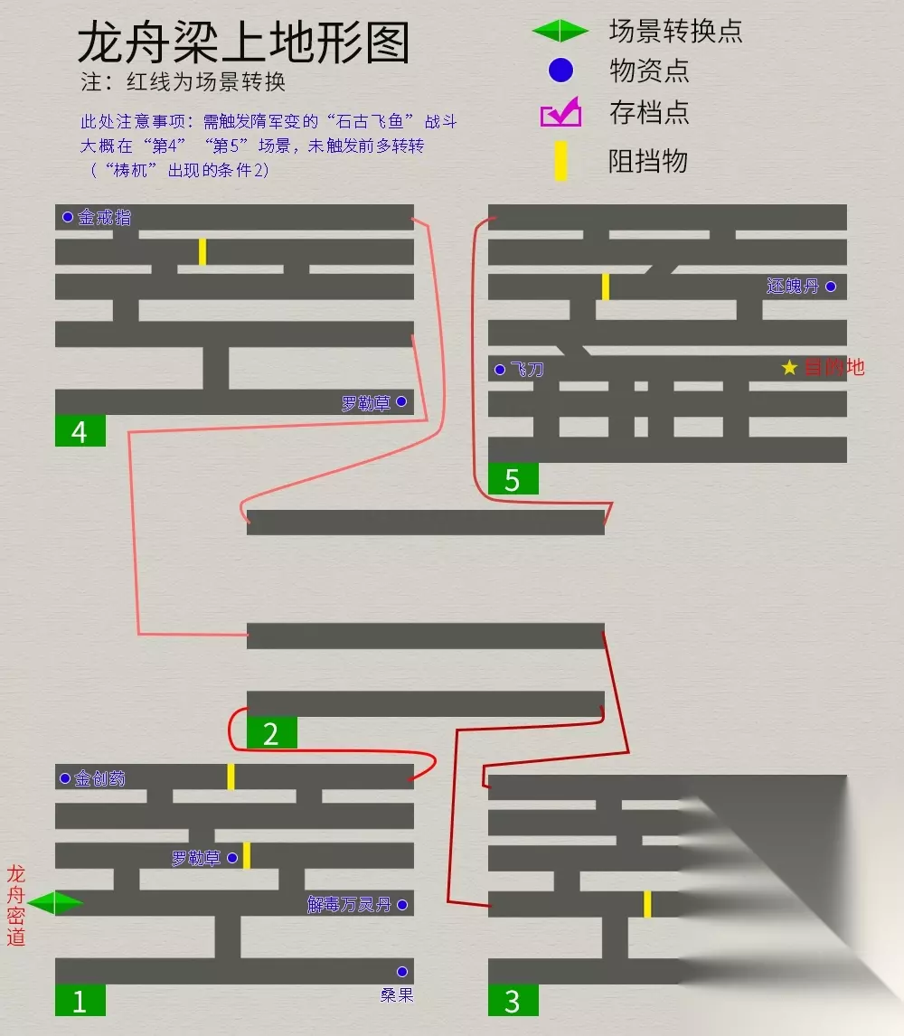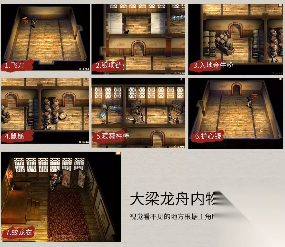 大梁/龙舟 流程:与客栈门外徐老头对话→避开守卫上龙舟→找到鼎房→被发现触发战斗→进入密室逃生→通过龙舟屋梁,剧情过后到达河畔小木屋。 支线任务(推理游戏):与街上的三个小孩对话,谜底选“小四”,奖励“神秘果*1” 注意事项:①进大梁后,先去药店购买3份“白色药材”(后期没有)②在龙舟密室通道内触发与两隋军队长的战斗,解决上面那个,下面那个选择"饶过他"(“梼杌”出现的条件1);③在龙舟梁上触发隋军变的“石骨飞鱼”战斗(“梼杌”出现的条件2);④到梁上终点后,可把张烈的装备卸下,因为在此剧情结束后他将离队。 各地图与物品点如下(内部法宝--鼠槌):