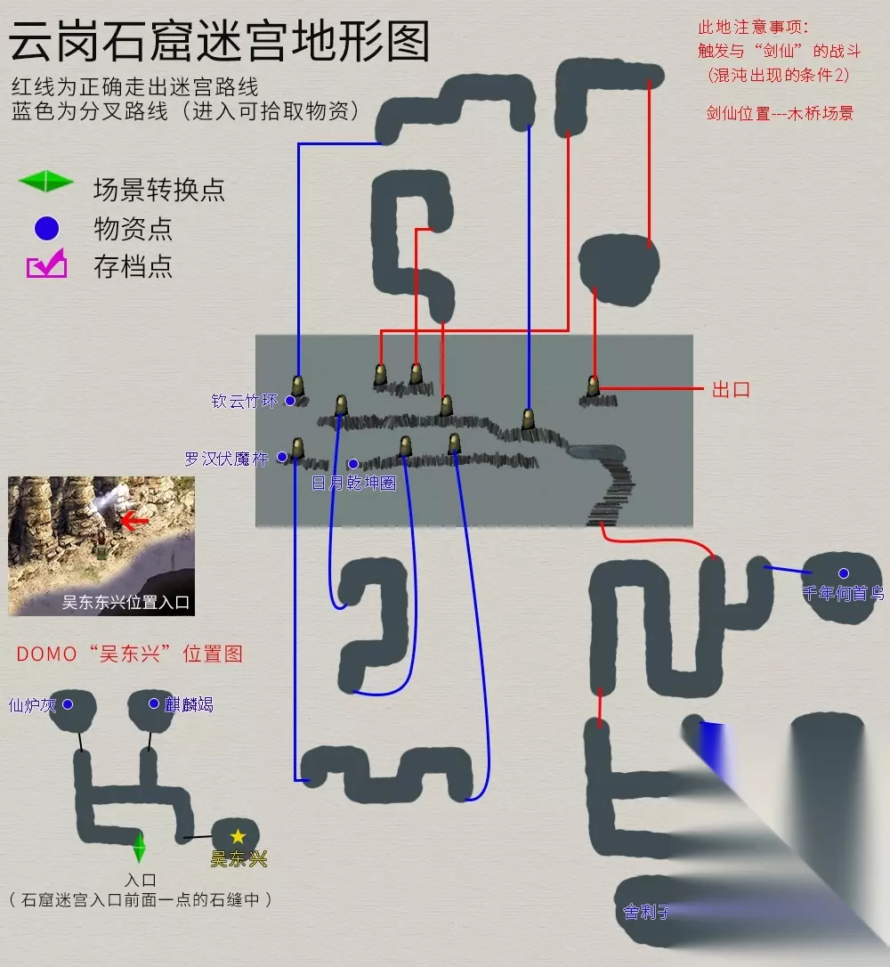 云岗石窟 流程:使用“汰玉如来”进入石窟→将“汰玉如来”放在顶层石洞平台→出石窟进入通天塔→进入洛阳。 支线任务 DOMO⑩吴东兴:在石窟入口前面一点的石缝中进入迷宫与吴东兴对话,提供3个“彗星碎片”即可。 注意事项:在木桥场景触发与“剑仙”的战斗(“混沌”出现的条件2)。