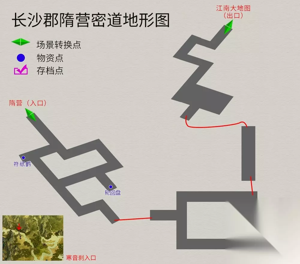 杏山见到“乔岱娘”,乔岱娘答应帮忙除去藤蔓,同时也答应为她购买花种。通过大禹水道,到达长沙郡。大禹水道地图很简单,这里就不放了,就两个“十”字路,内部物品总共两样:钱*300、碳粉。 长沙郡(先去花店买好花种备用。) 流程:街道路口与宁珂对话→客栈密谋→勇闯城外隋营→密道追击“上官震远”→再遇郡主→出密道返回江都(出口即在杏山南面,可先去把花种任务交了,获得法宝“奇魄古玉”) 支线任务(可先完成后再去做主线任务) DOMO⑦王福生(包裹里面准备好符纸鹤):在街道上与一名紫衣女子对话,直到紫衣女子说出“长沙西北有颗神树,听说通往镇压巫山神女的寺庙”→前往寒音刹(城外大树那)→在迷宫终点屋内见到王福生,对话不可选“先要求酬劳”,提供符纸鹤即赶回DOMO组。(如果长沙被毁前未与紫衣女说话,与江都左下角云游道士对话也可触发)