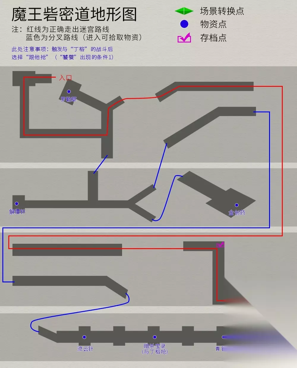 魔王砦 流程:从豆子坑来到砦门口→池边商量进砦对策→返回豆子坑→进入魔王砦密道→尽头处遭遇程咬金→大厅与程、秦对话→宇文太师来夺鼎→与程咬金战斗→离砦寻鼎。 注意事项:①入砦方法有两种,一种是用竹管从水中潜进去;另一种是藏在“小叶子”车上混进去。选择第一种方法加玉儿好感度,另一种方法降低玉儿好感度。(购买竹管需寻找6个小孩,除了第一个在客栈旁的小围栏内外,其他5个全在前面一排看不见的石头边,一路按“空格键”过去);②魔王砦密道内开宝箱遭遇“丁格”,选择跟他抢(“饕餮”出现的条件1)。魔王砦密道地图如下(法宝--暗杀宝录):