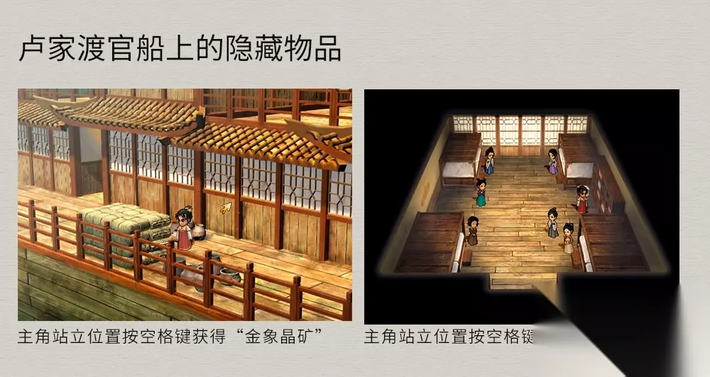 卢家渡 流程:船头触发任务→搜集花朵(制胭脂)→与小兰换取乌蛮簪子(右侧屋内)→与殷婆婆换取细丝绸(左上方屋内)→登上官船→完成剧情后到达大梁(任务所需物品可在客栈门口杂货商购买)。 支线任务 1.老张的烦恼:老张(客栈门口),与其一直对话,直到出现帮忙提示,选“不帮”,任务关闭;选“资助一百两”可得“紫玉冰晶*1”;选“资助三百两”可得“映霞钢环*1”。 2.神秘宝藏:杜大娘(右边民房)→依次调查码头木桥、阶梯左边石头、客栈门口的大伞、大伞下面的5个罐子,完成后可得“地稔根*1”。 船上隐藏物品:“金象晶矿、还灵丹”,位置如图。其他物品都在宝箱内,容易找。