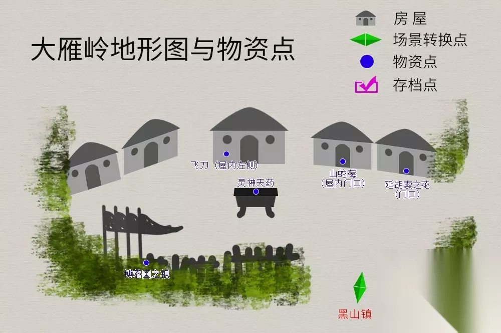 大雁岭 流程:进左侧屋内与玉儿对话→出门与张烈对话→(6日后)进中间帐篷与张烈对话→前往卢家渡。大雁岭地图如下: