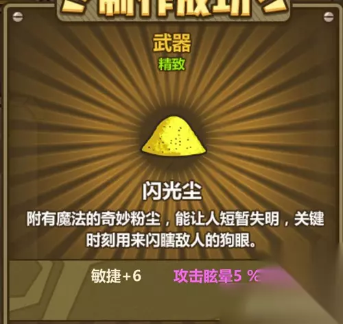 类型:武器 稀有度:精致 属性:敏捷+6 攻击眩晕5%(2/S) 说明:富有魔法的奇妙粉尘,能让人短暂失明,关键时刻用来闪瞎敌人的狗眼。 炼金配方 肉骨头+肉骨头+黑暗圣书+闪亮的磷粉 闪光尘的用法需要自己摸索,不是每次都能派上用场,但关键时刻绝对够看。游戏中的小技巧多尝试,才能找到最适合的打法。 我们整理的这些信息够参考了,想要了解更多手游攻略可以关注我们。游戏嘛,多尝试才能找到乐趣,别光看属性,实际用起来才知道效果。