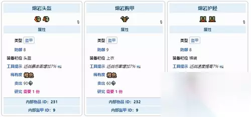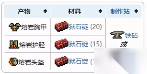 泰拉瑞亚1.4熔岩套装获得方法 黑曜石套装由【熔岩头盔】、【熔岩胸甲】和【熔岩护胫】这三个部件组成。 它们的合成配方如下: