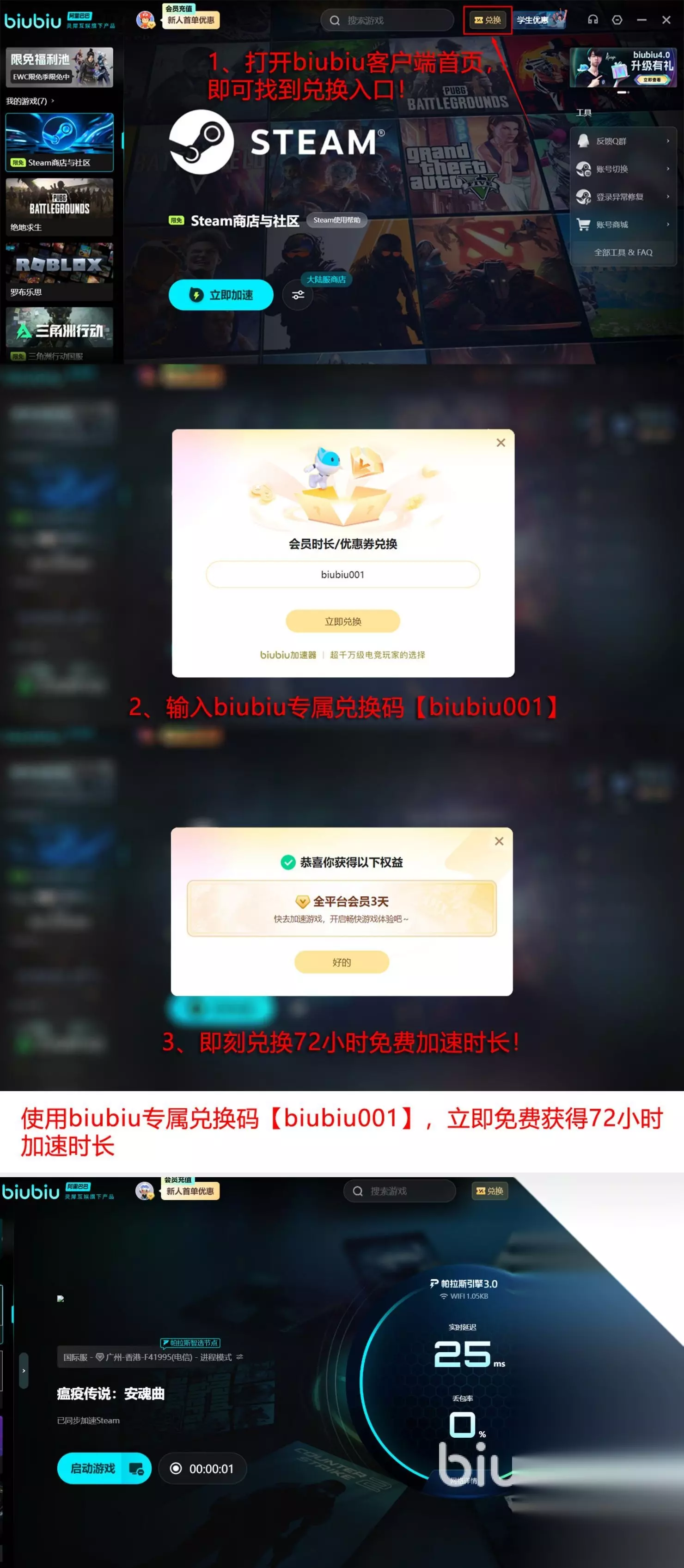 在各种技术的加持之下,在很多高电竞的场景中也得到了验证,Pubg冠军左梓轩已经为其代言。其实众多游戏都会遇到网络堵塞等一系列的问题,那么此工具却可以完美地规避。除了这些优势以外,也携带着重大的福利重磅来袭,当我们第1次激活的时候就可拥有24小时的加速时长,等到全部使用完之后就可利用【biubiu001】,拥有三天的加速时长,那么这样算下来一共就合计达到96小时。