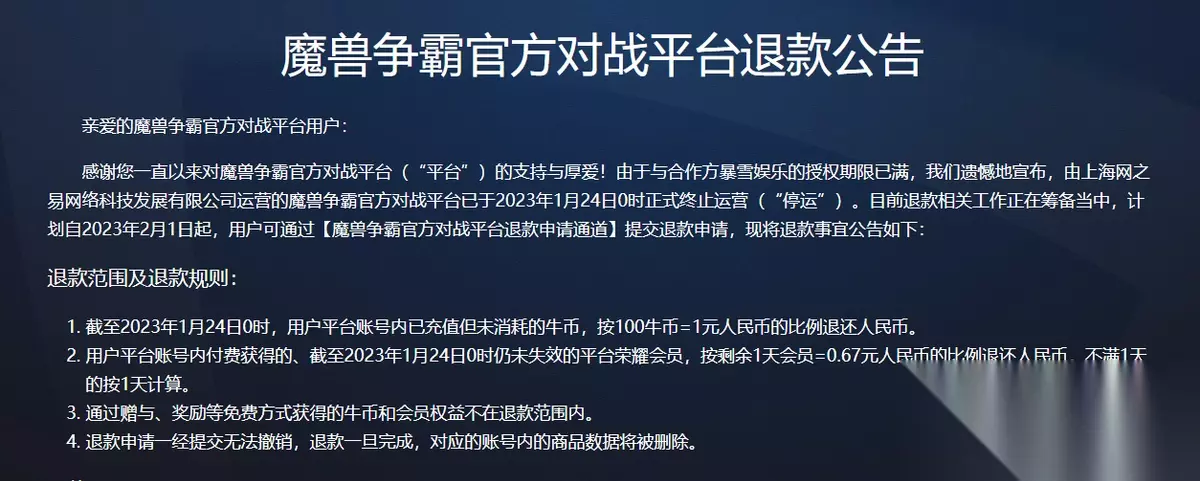 下载)"> 也许暴雪全家桶的玩家比较好奇为什么在退款公告里并没有看到《魔兽争霸》官方对战平台,因为其退款内容是单独发布的,如果你的账户里有没用完的牛币可以退,剩下的荣耀会员也精确到按天来退款。 其实要论这几个关服的游戏,《魔兽争霸》的老玩家应该属于是最佛系的,对战平台的道具也都属于是用来向地图制作者购买一些地图特权。国服后期出现的官方平台,确实解决了以前RPG地图制作者和玩家的很多痛点。