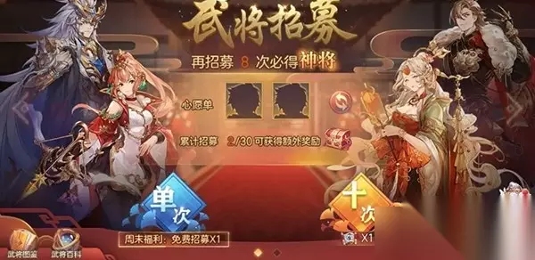 六、招募 1、通关第6章,会送10张招募券。 2、心愿单,需要累计招募到100次才解锁。